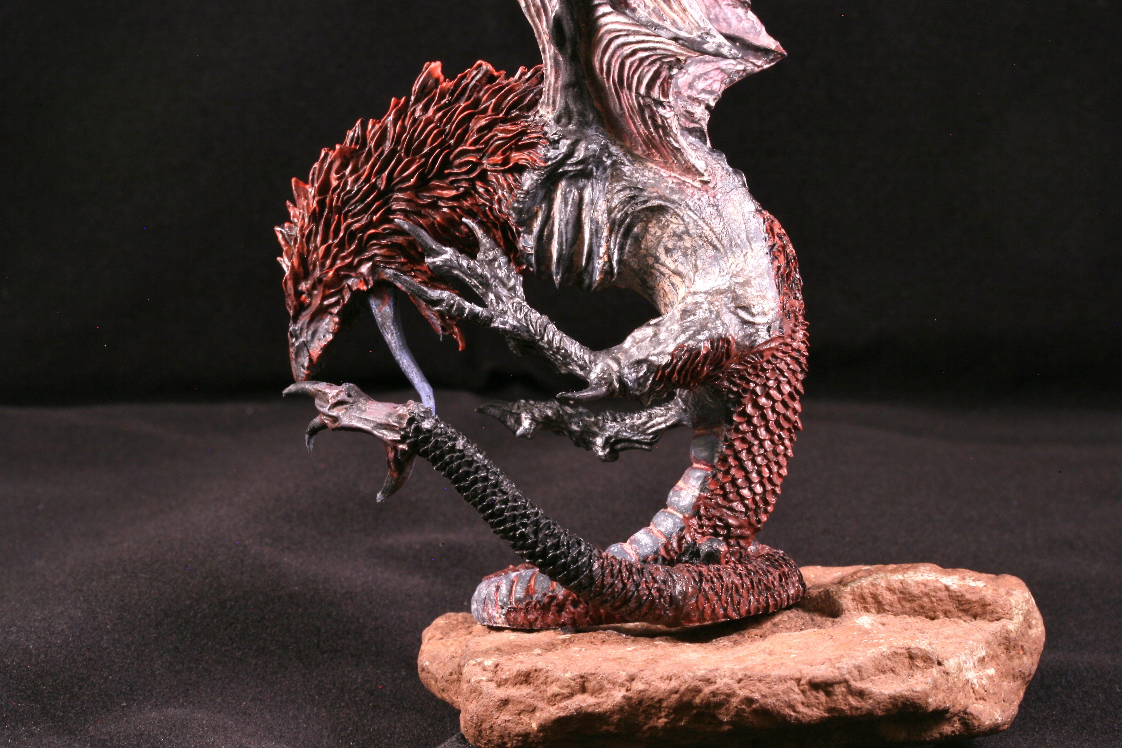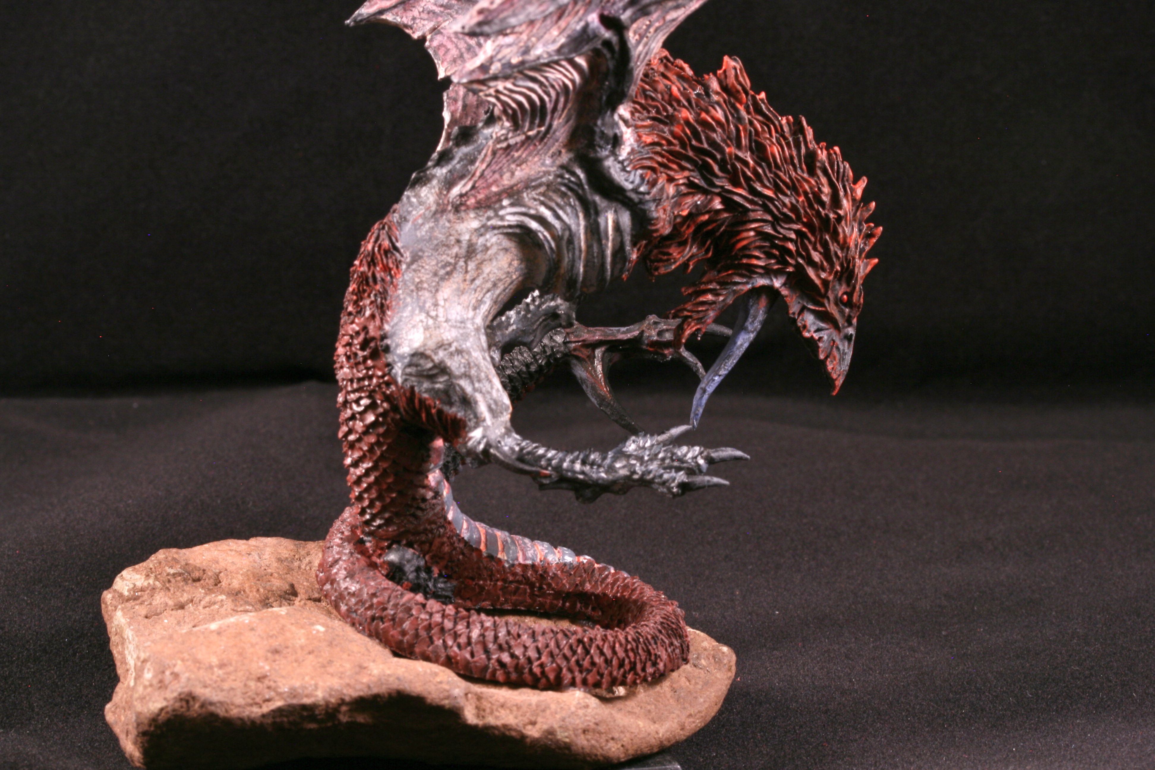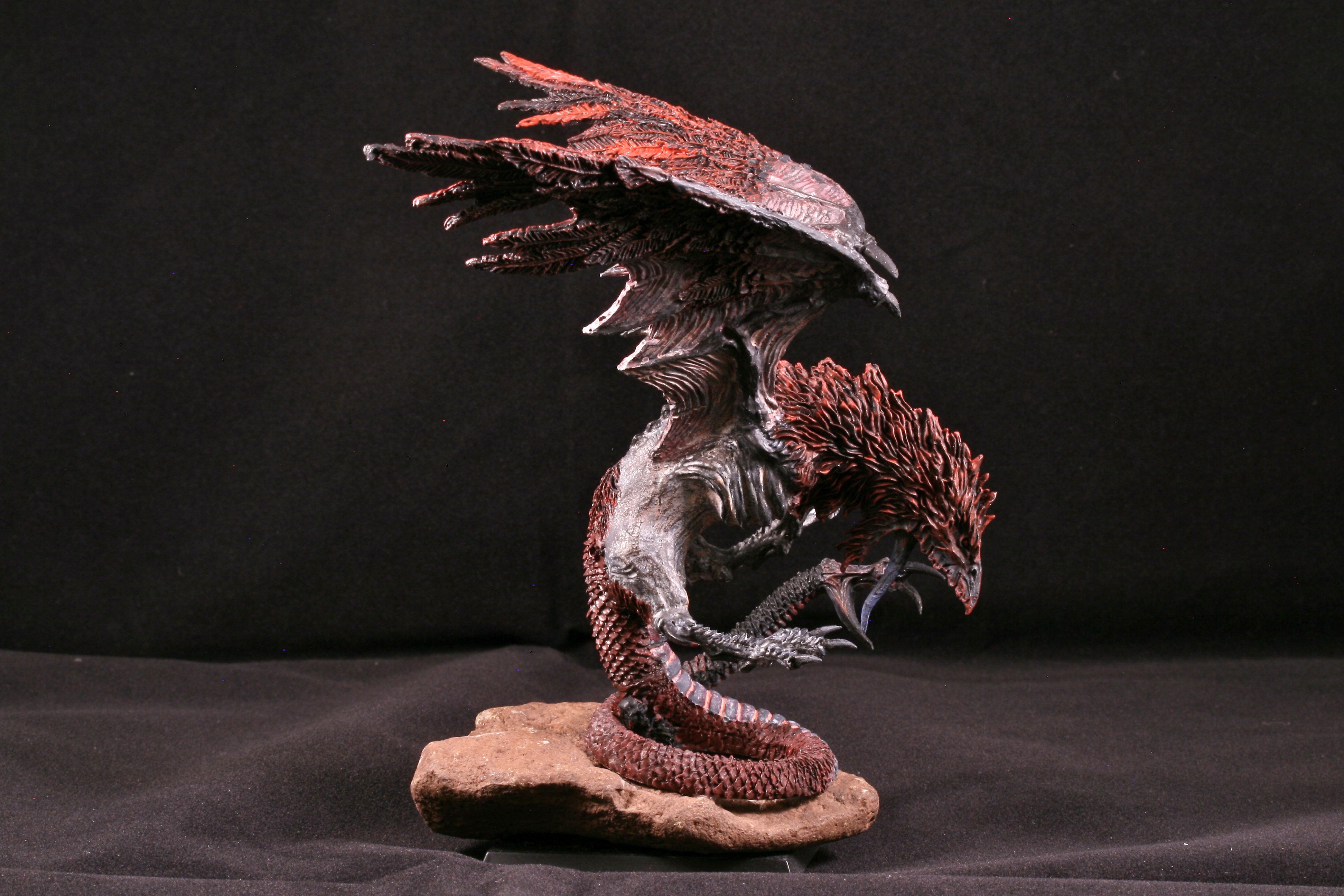 Sickly pink, grey and black flesh. Reddish brown tail scales, terminating in black. Reddish brown mane with blood red highlights. Mottled brown, black and red feathers. Mounted on sandstone.