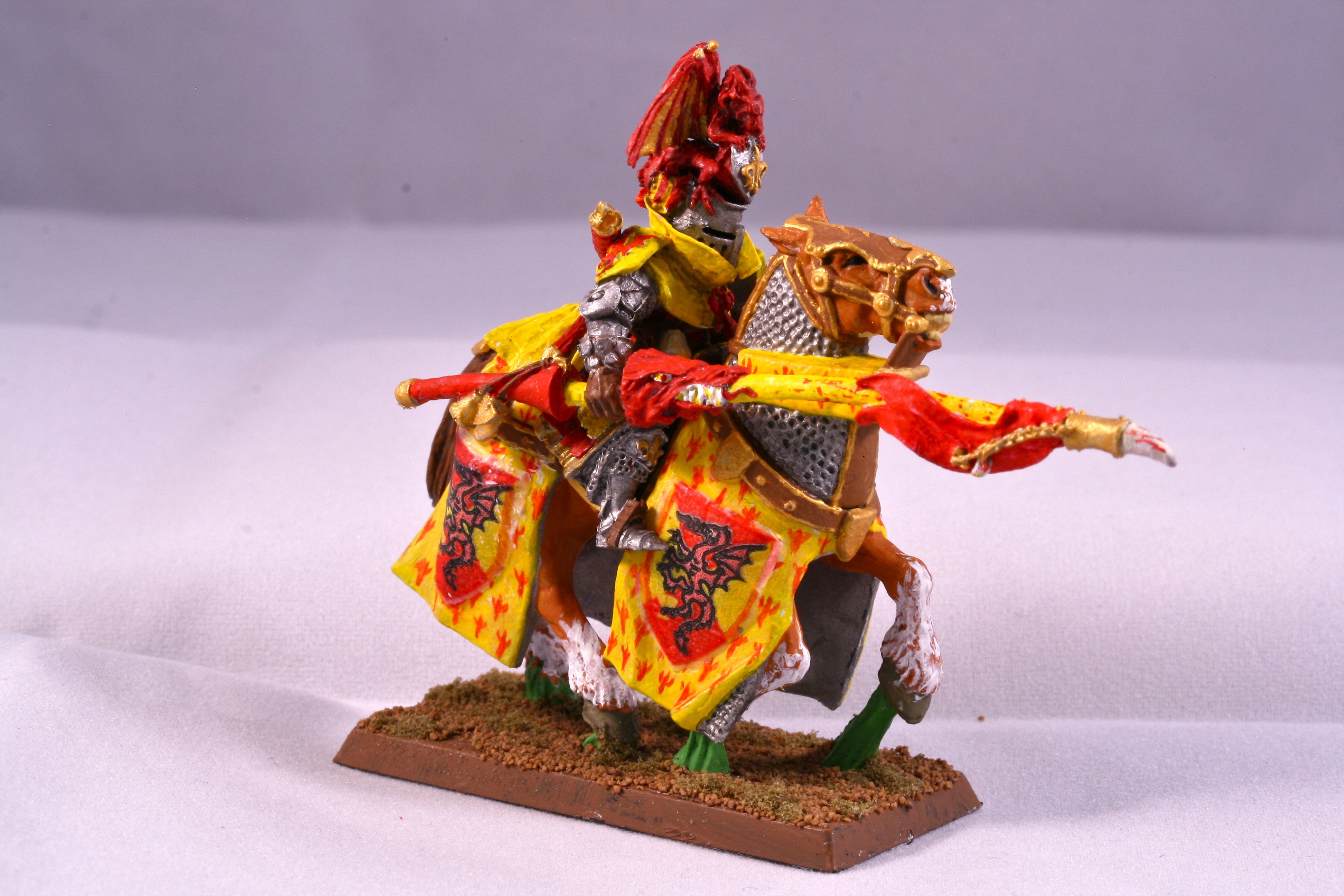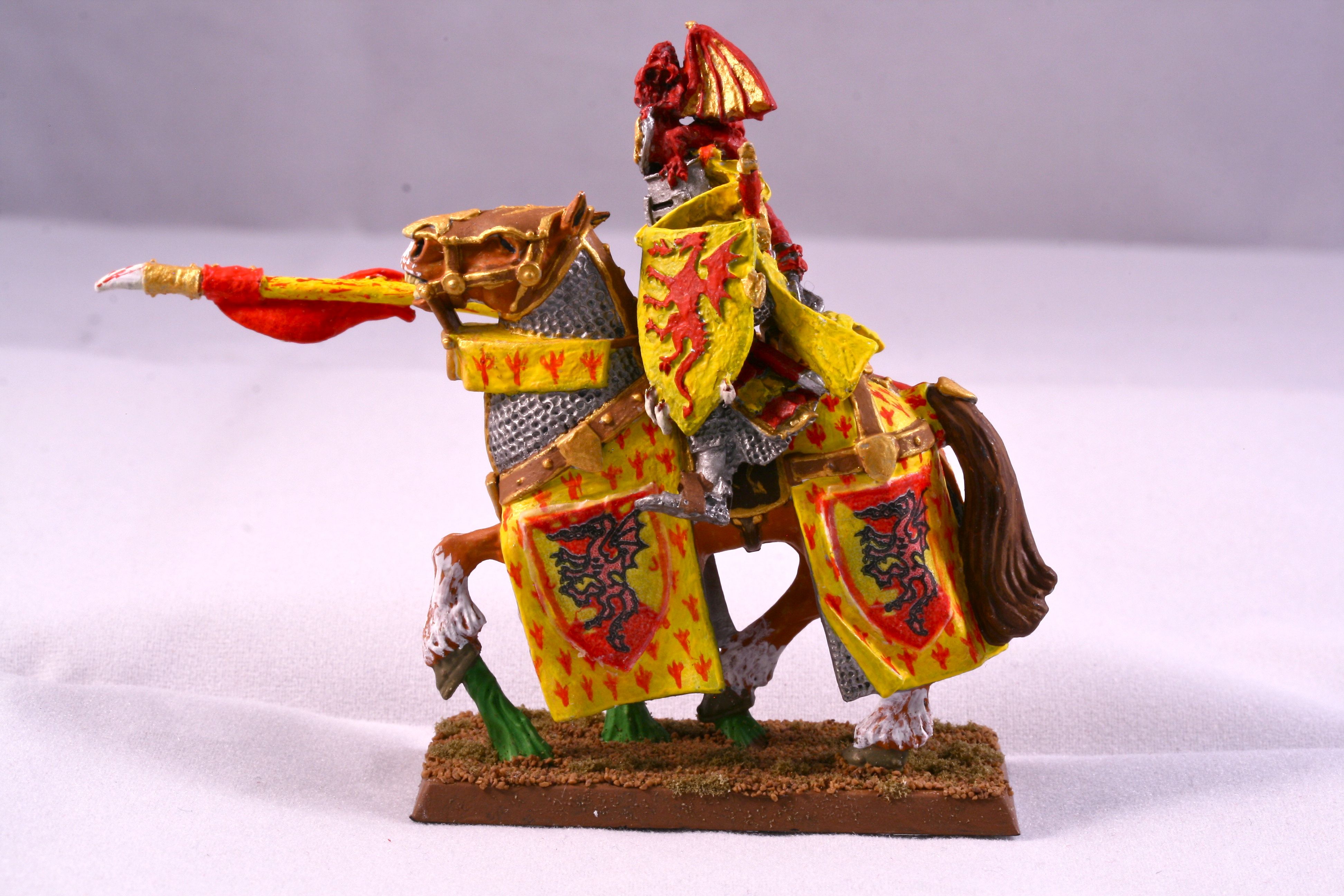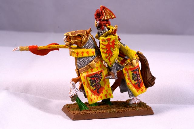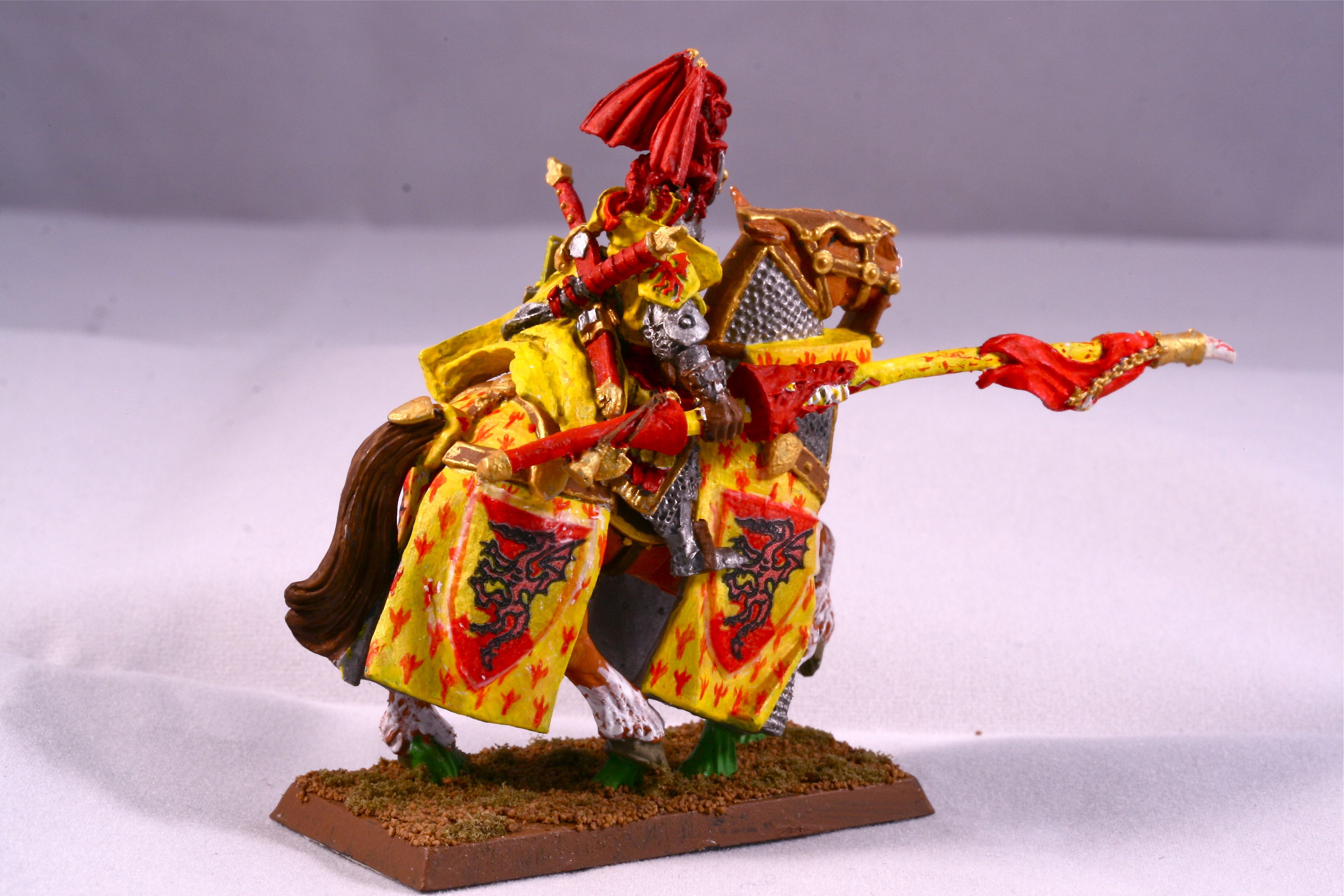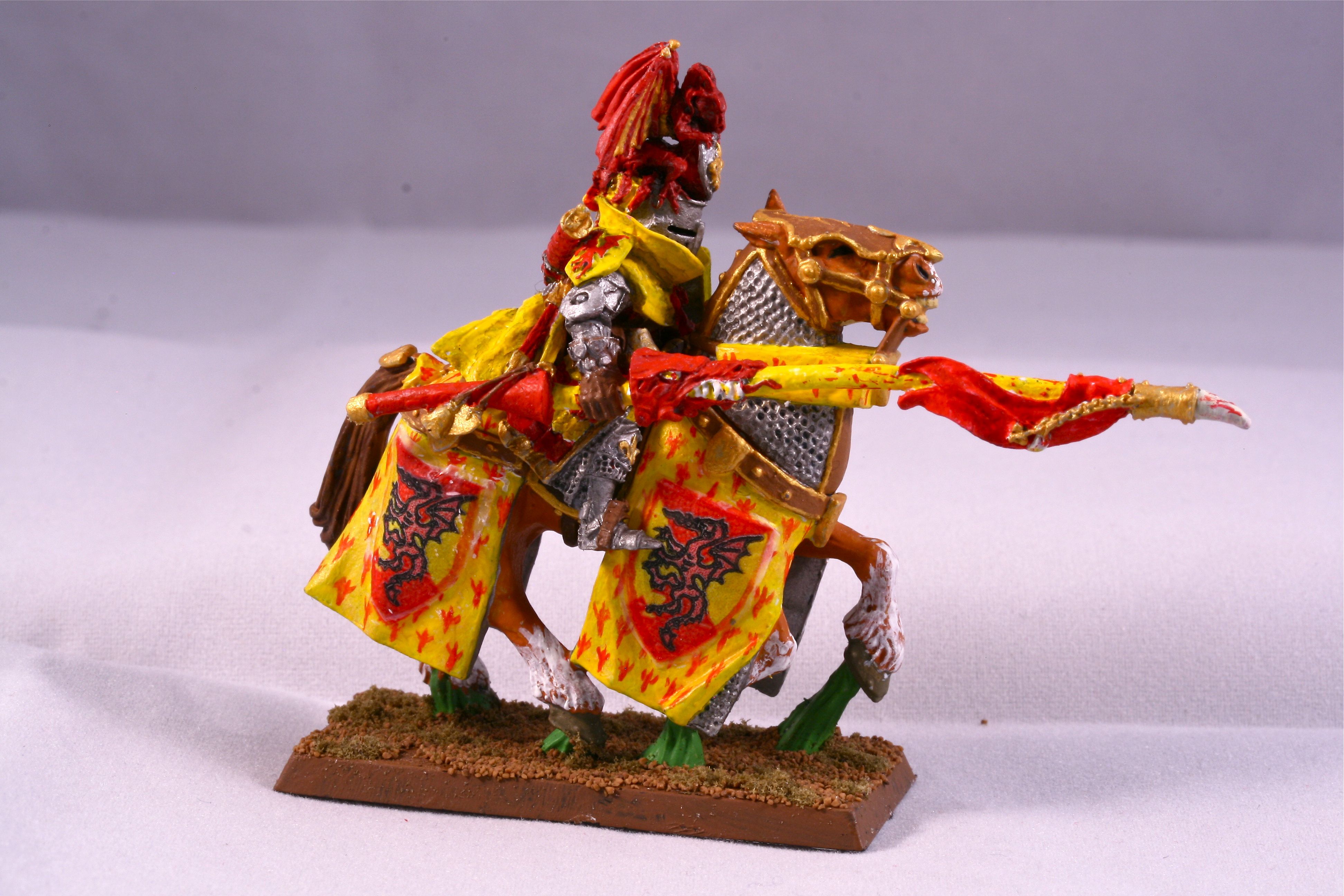 Bohemond’s bright red and yellow colors are recognized well beyond the realms of Bretonnia. The symbolic dragon clutches the sacred grail in its lower claws.