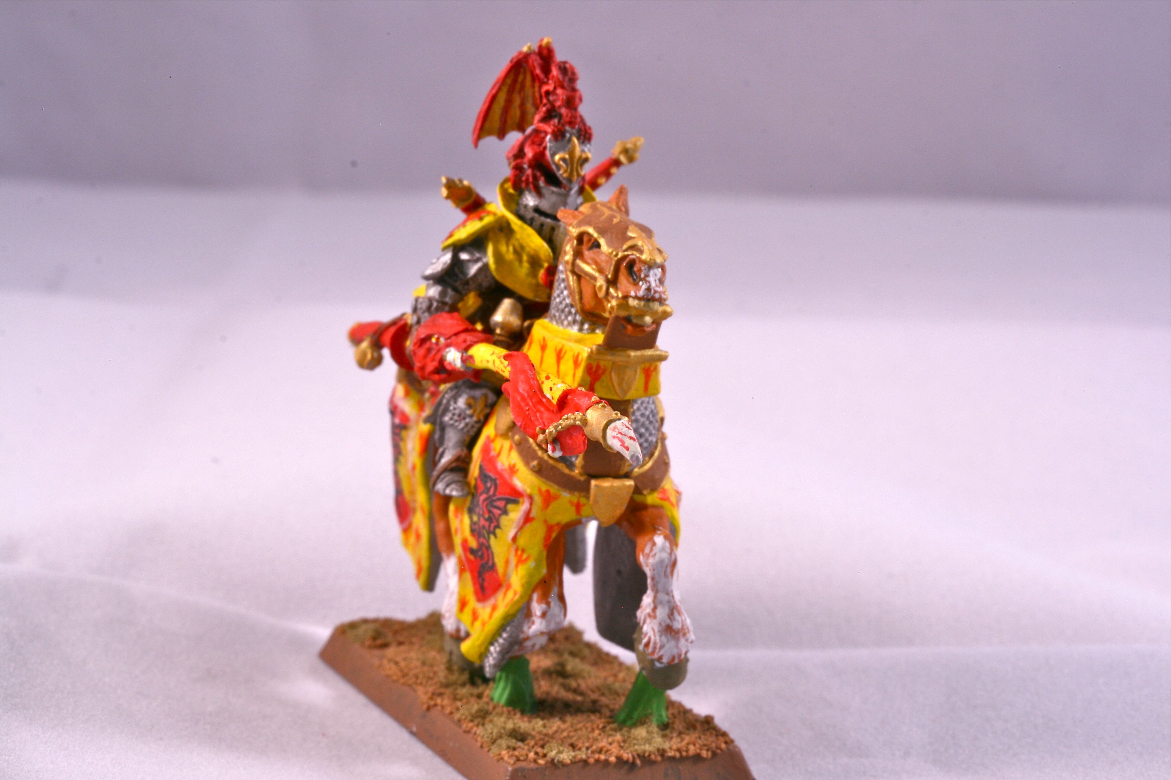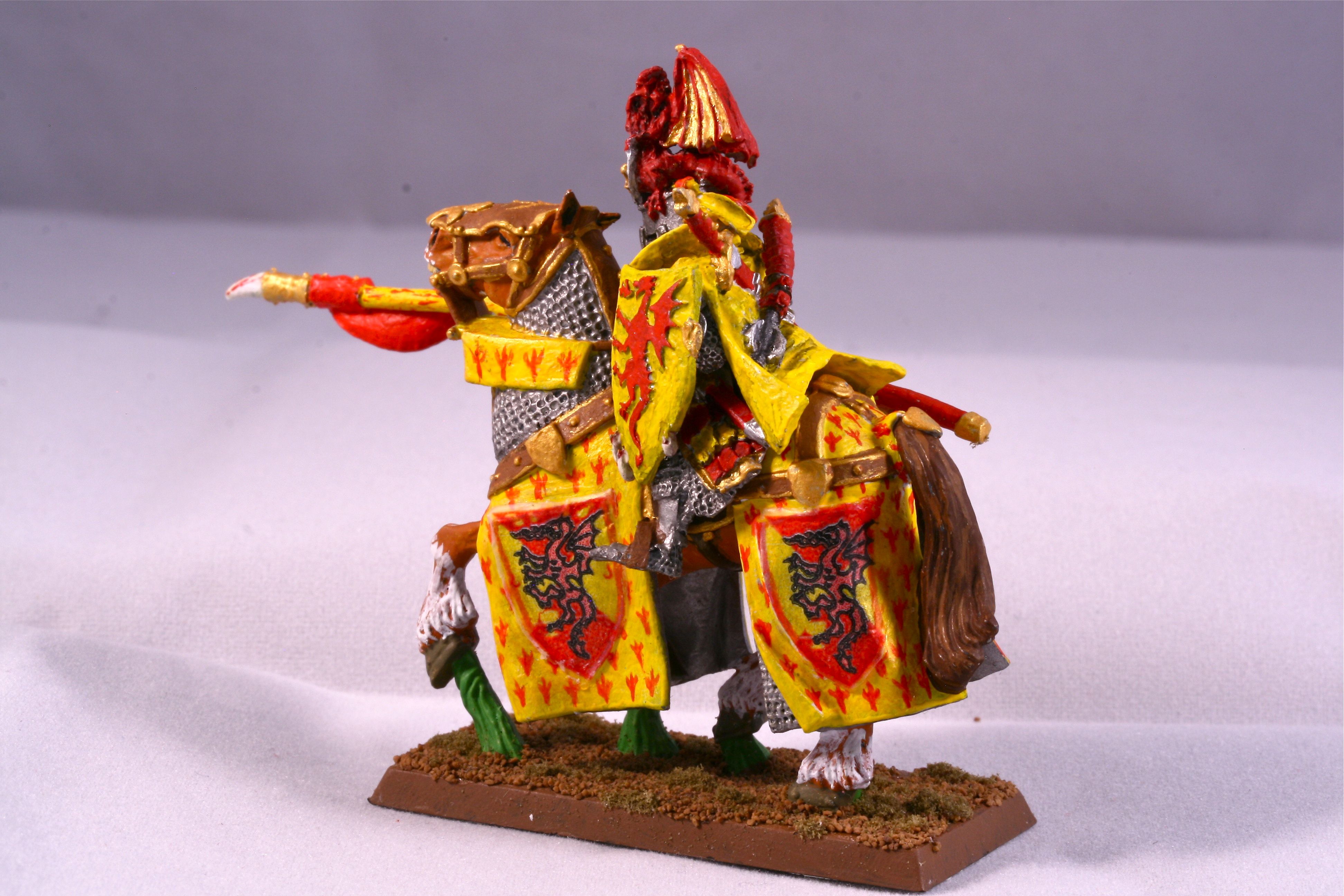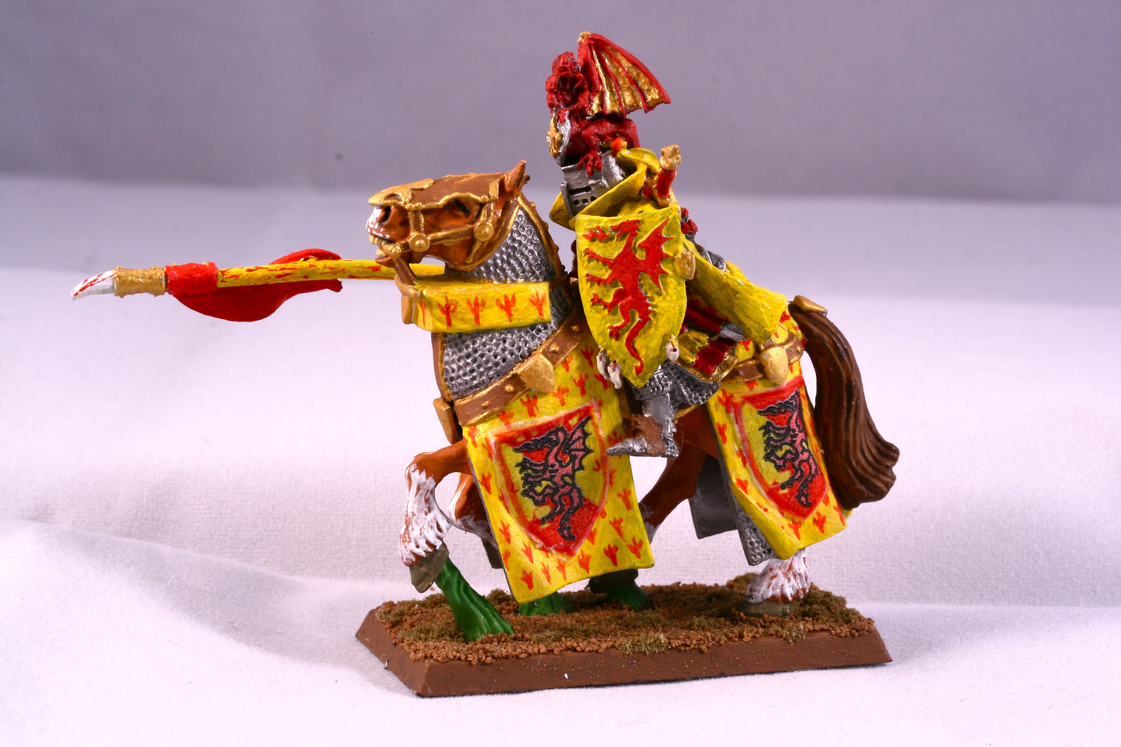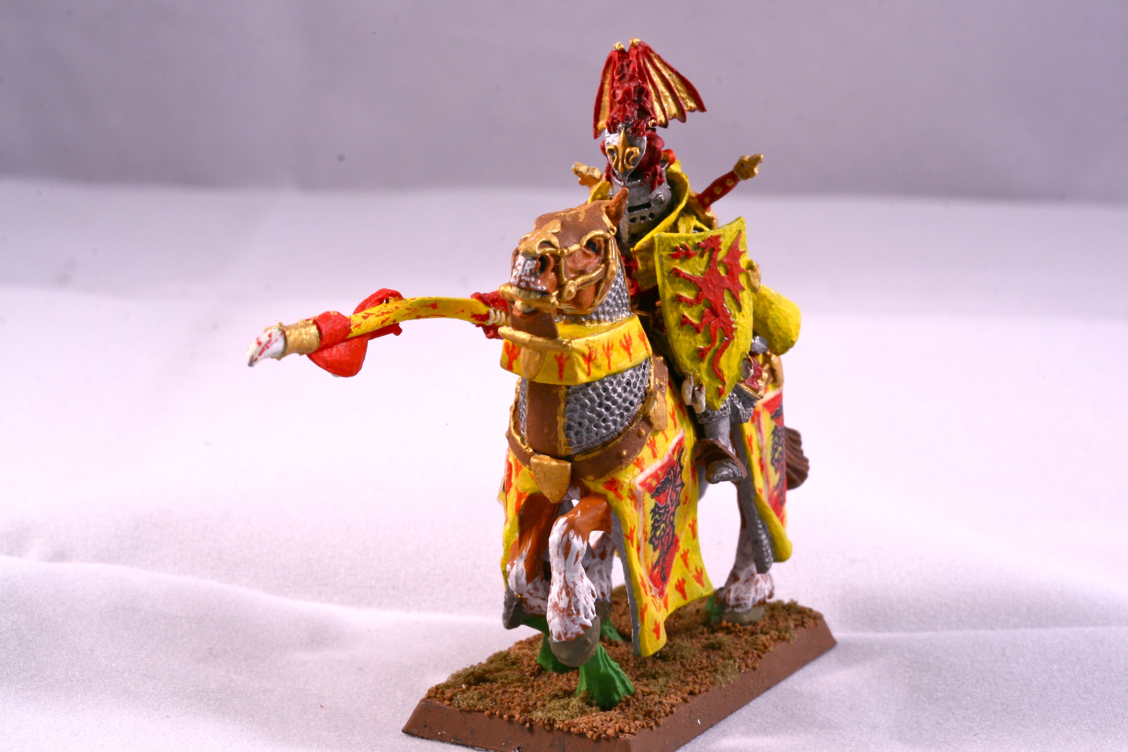 Bohemond’s bright red and yellow colors are recognized well beyond the realms of Bretonnia. The symbolic dragon clutches the sacred grail in its lower claws.