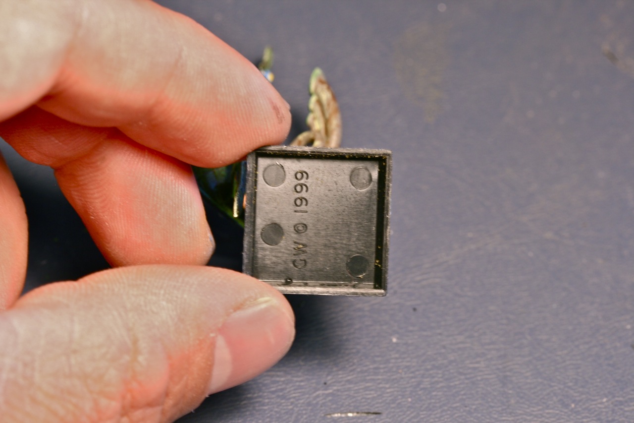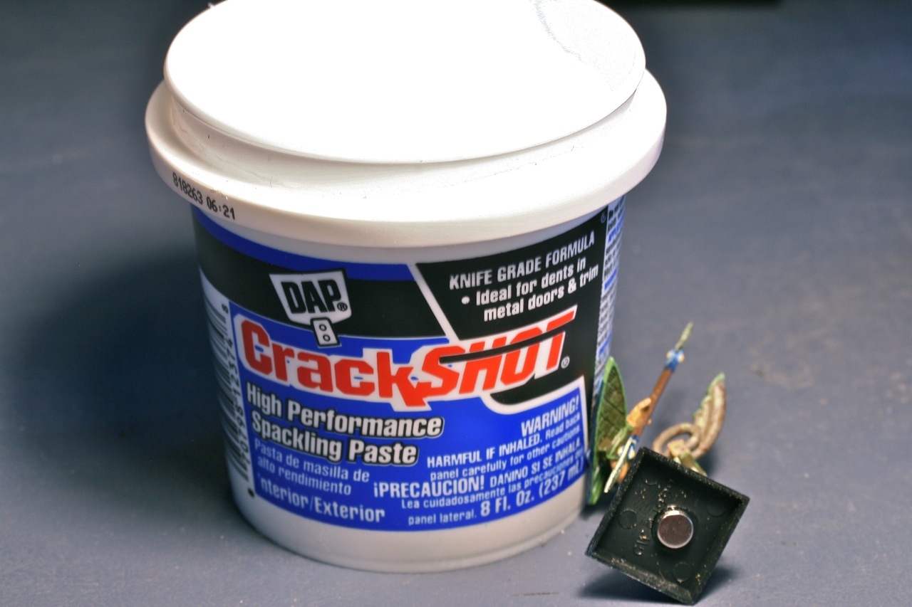 Why the spackling paste? The rare earth magnet I used is actually very strong. Recall that I build my movement trays out of sheet steel. The magnetic force to the tray is strong enough that the magnetic disc can often break free from the superglue and the plastic base. The paste, when dried, helps attenuate the magnetic pull, and physically restrains the magnet to the plastic base.