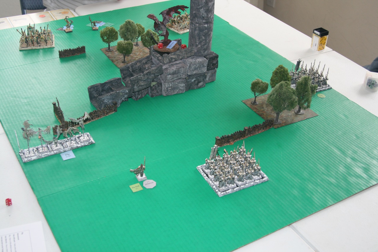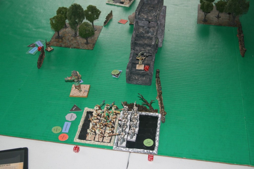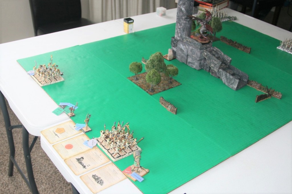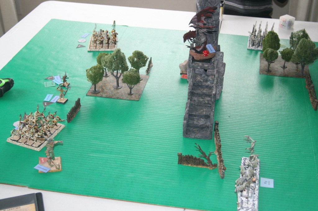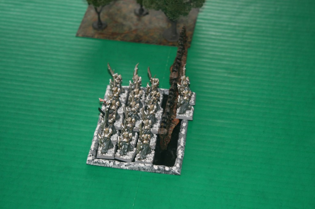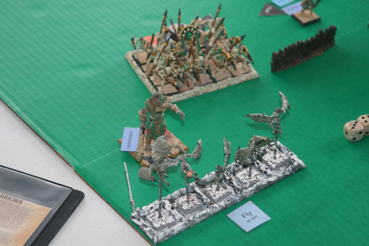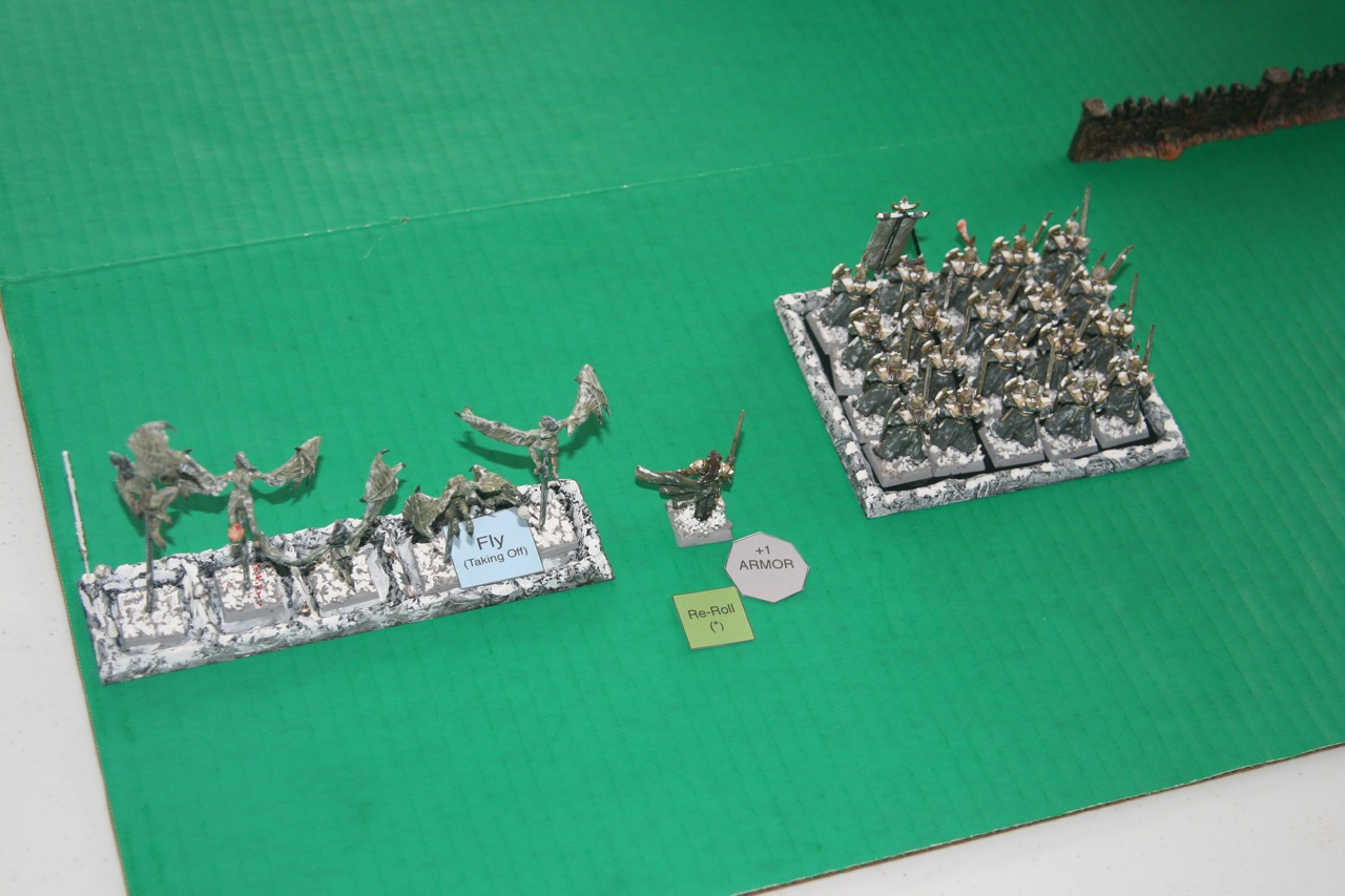 The Dark Elves start first, and all units move forward into the battlefield. The Harpies get off the ground and into the air. (House rules for Flying).