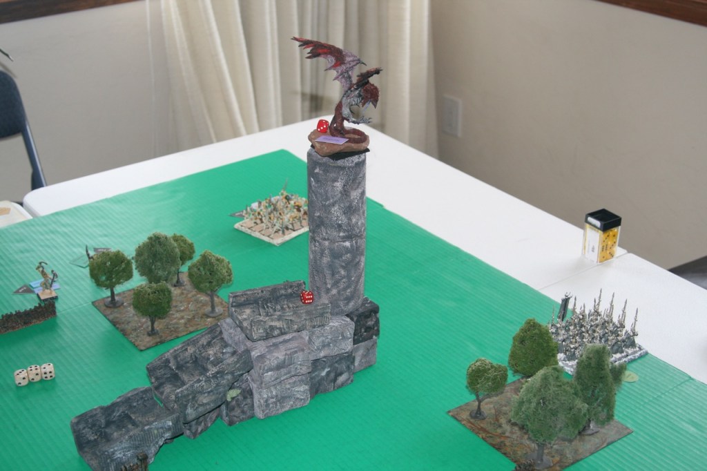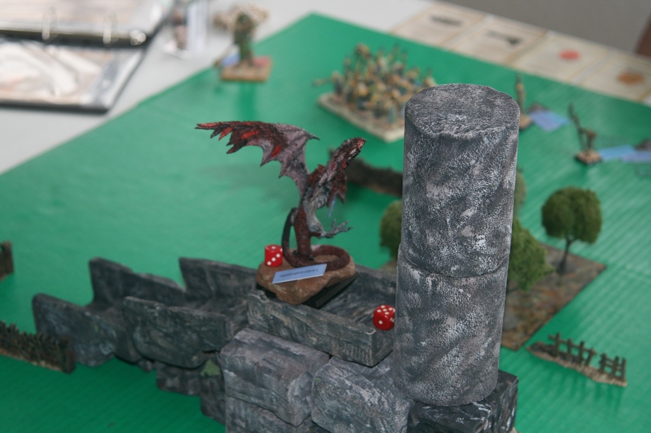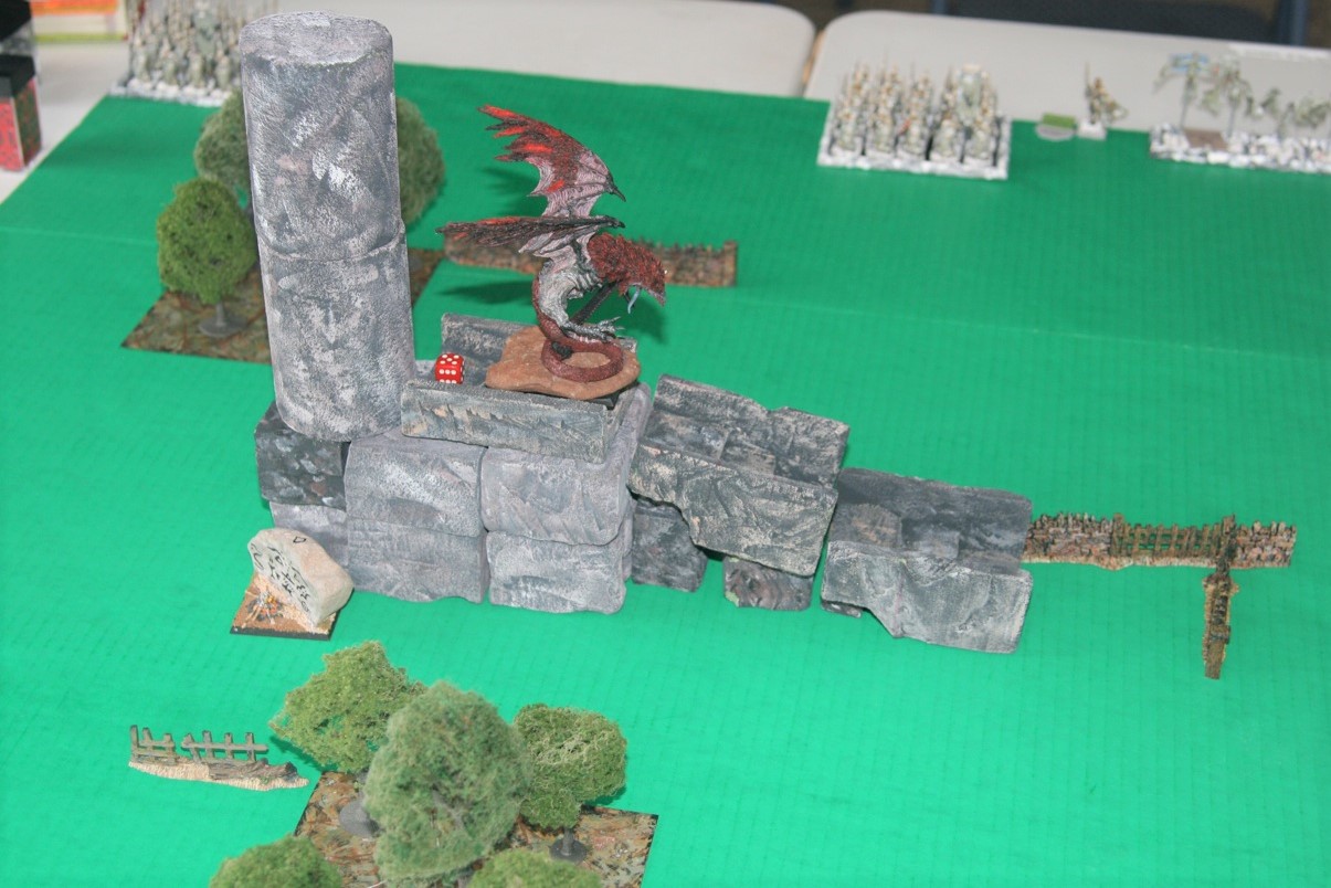 The battlefield contains an arcane ruin, with a stairway that leads up to the landing where the Cockatrice is perched to protect the treasure. On the far end of the landing, a large tower reaches to the sky. There are two small regular forests on both sides of the ruins. Some regular fences are scattered around the battlefield. A Bane Stone sits at the bottom of the tall tower on the side of the Tomb Kings. Any unit within 6 inches of the Bane Stone is +1 easier To Wound.