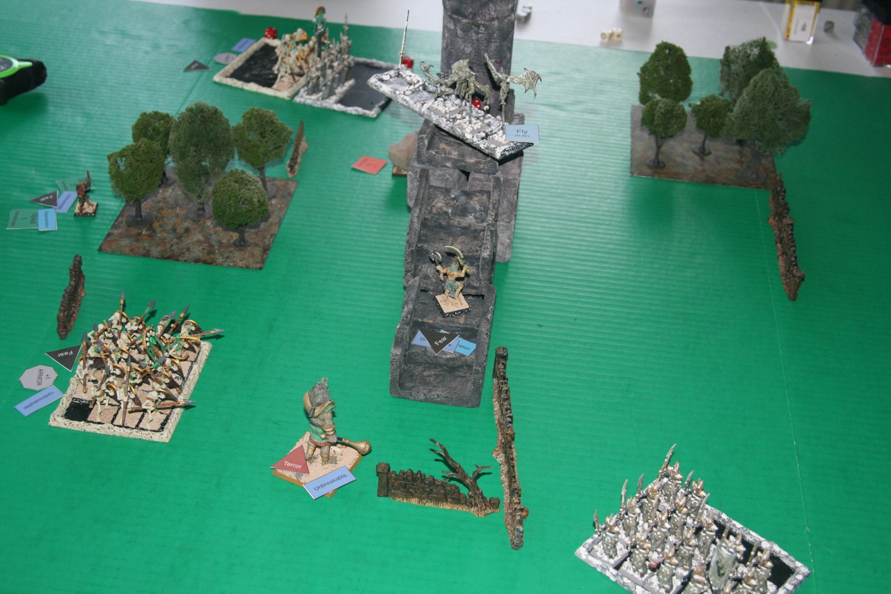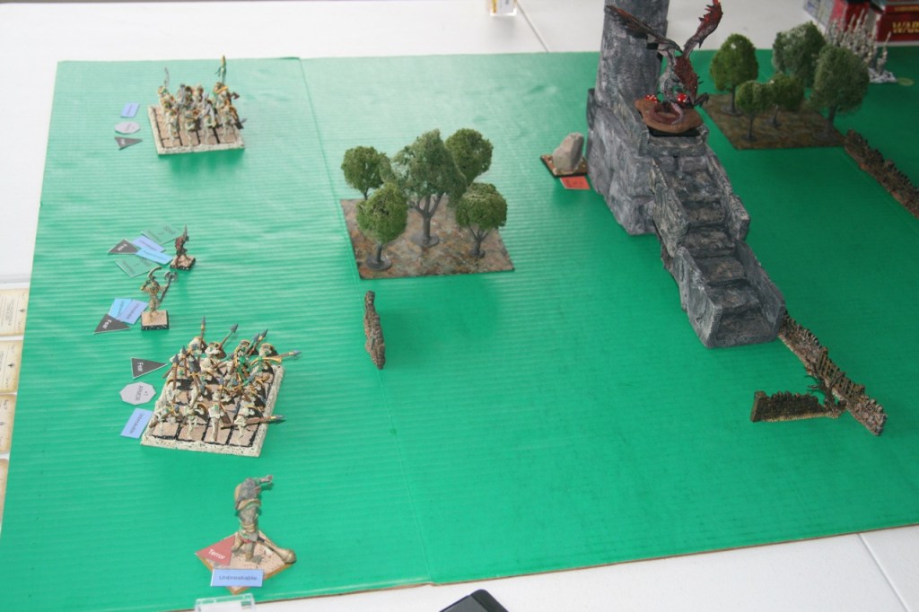 The Tomb Kings all close in. The Hierotitan now aims his Icon of Ptra at the Master Elf, but the elf dispels it. All Tomb King magic is unsuccessful this turn.