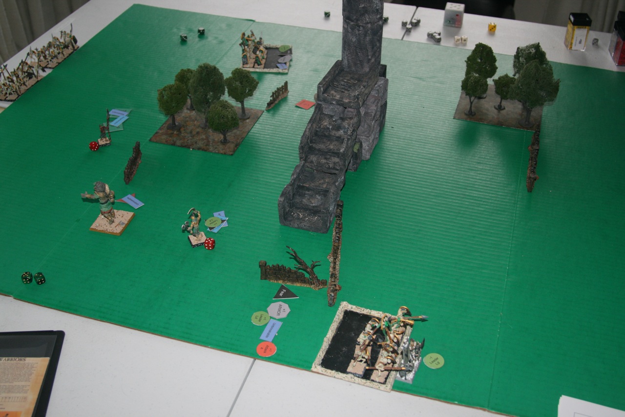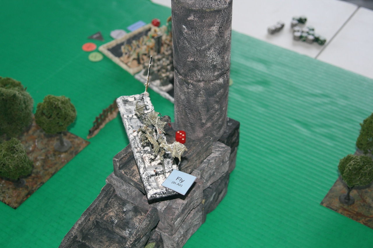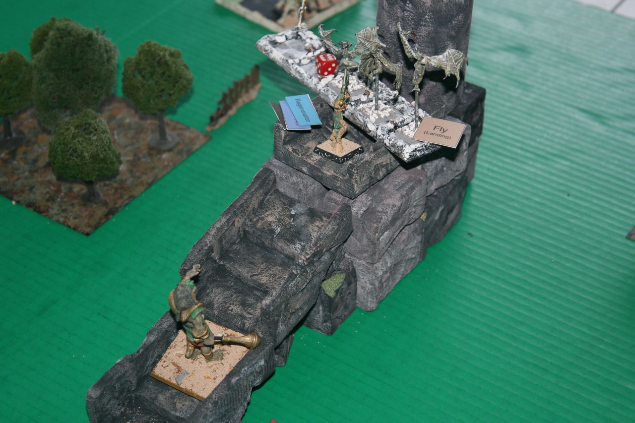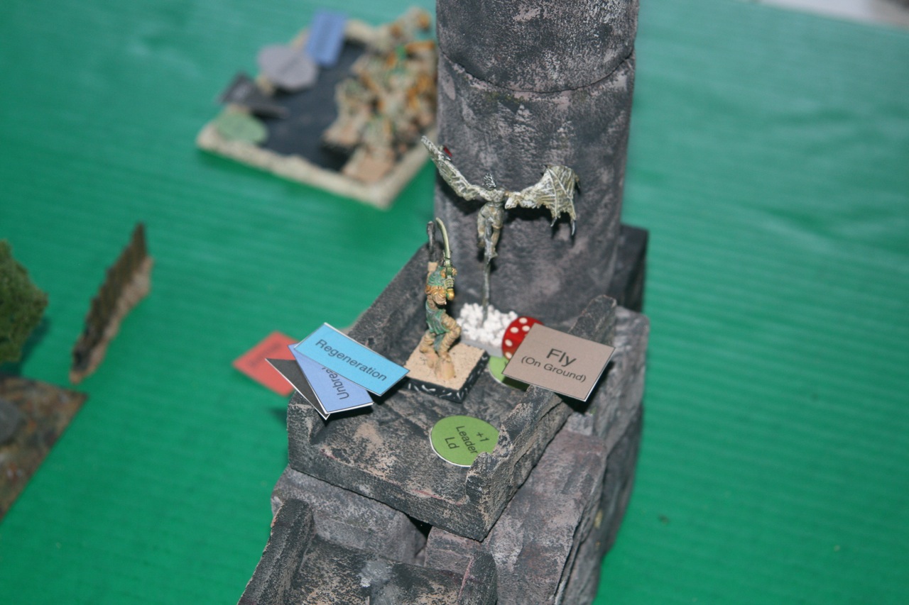 On its turn, the Cockatrice pivots right again, and leaps on top of the tower. It threateningly gazes down upon the warriors below. It now has the Stupidity rule. (All Cockatrice movement and actions are randomly generated and based upon a combination of Warhammer Armies Project Rules and some extra house rules.)