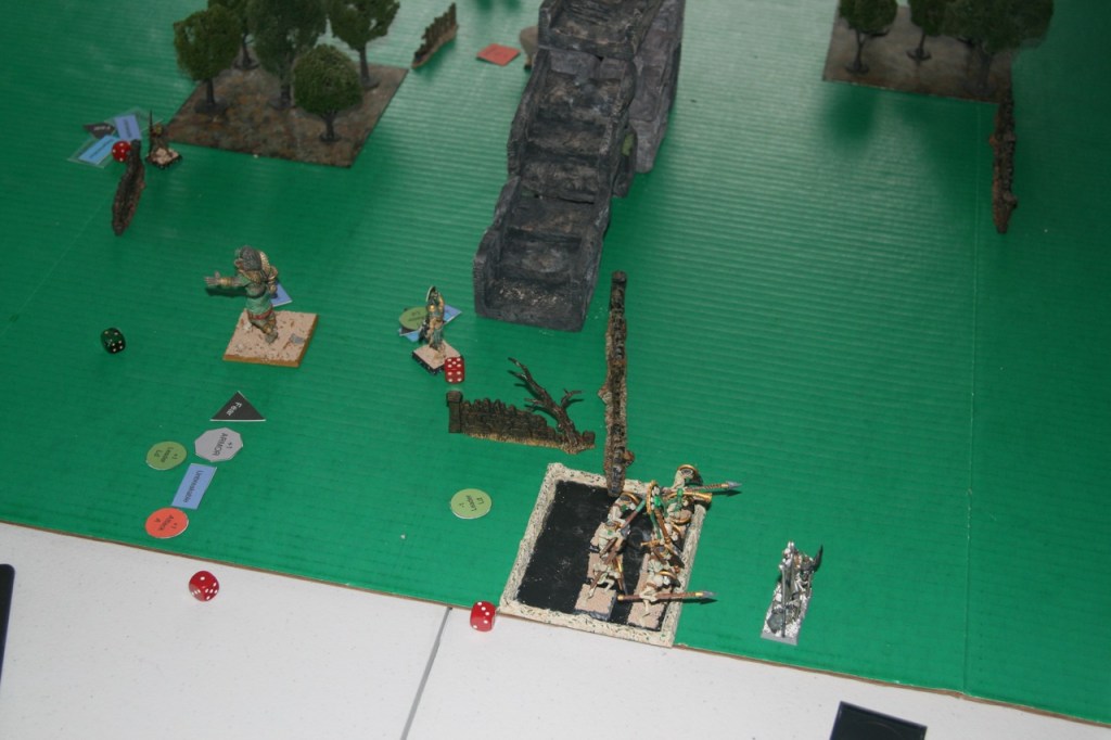 The Master Elf enters the ruins and starts heading up the steps toward the treasure. This is as far as the Master Elf gets, and is never seen again. The Hierotitan attacks the Elf with its Spirit Leech magic and deals him 4 unsaved wounds. The Elf never saw it coming and is now another corpse to haunt the ruins.