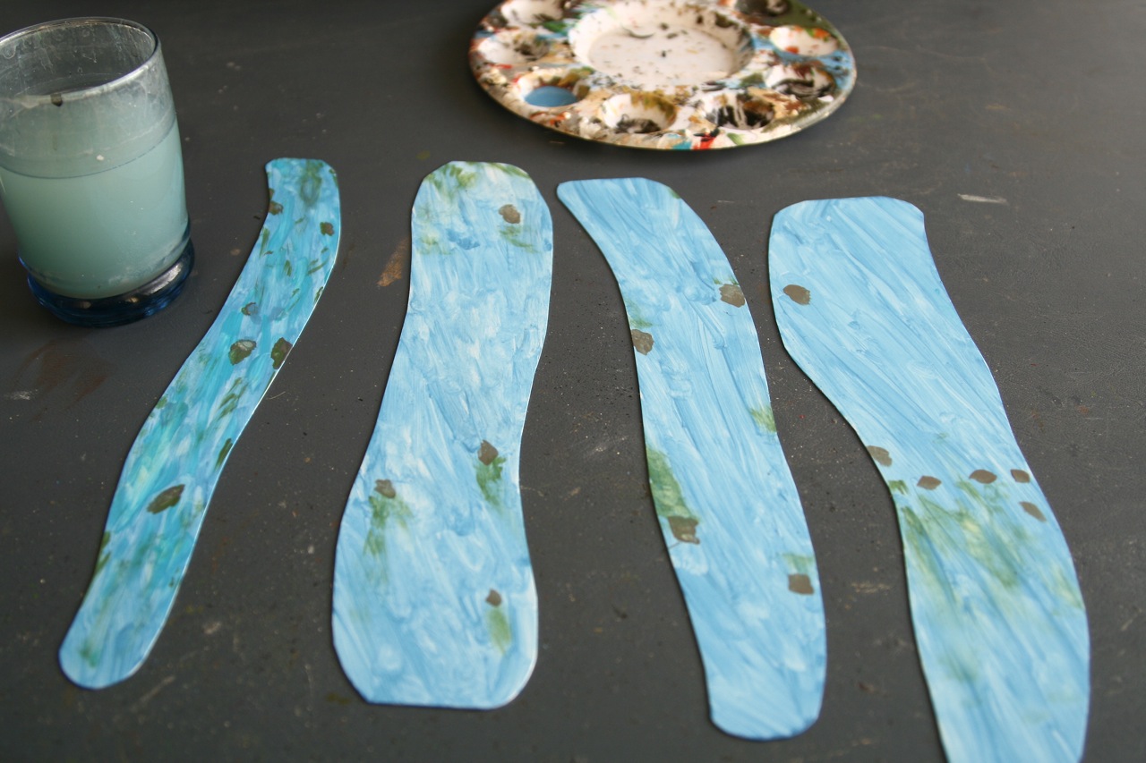 #3. The segments are highly modular. I can set the river up differently every time. I can choose how to overlap the segments, and can pivot them in any direction. For this reason, I suggest to only paint the water surface of the river. Avoid painting detailed shorelines, or other features along the segments. Details may prevent the many ways that you could arrange the segments without looking funny. I think in-stream rocks are okay, and I painted a few of them on these segments.