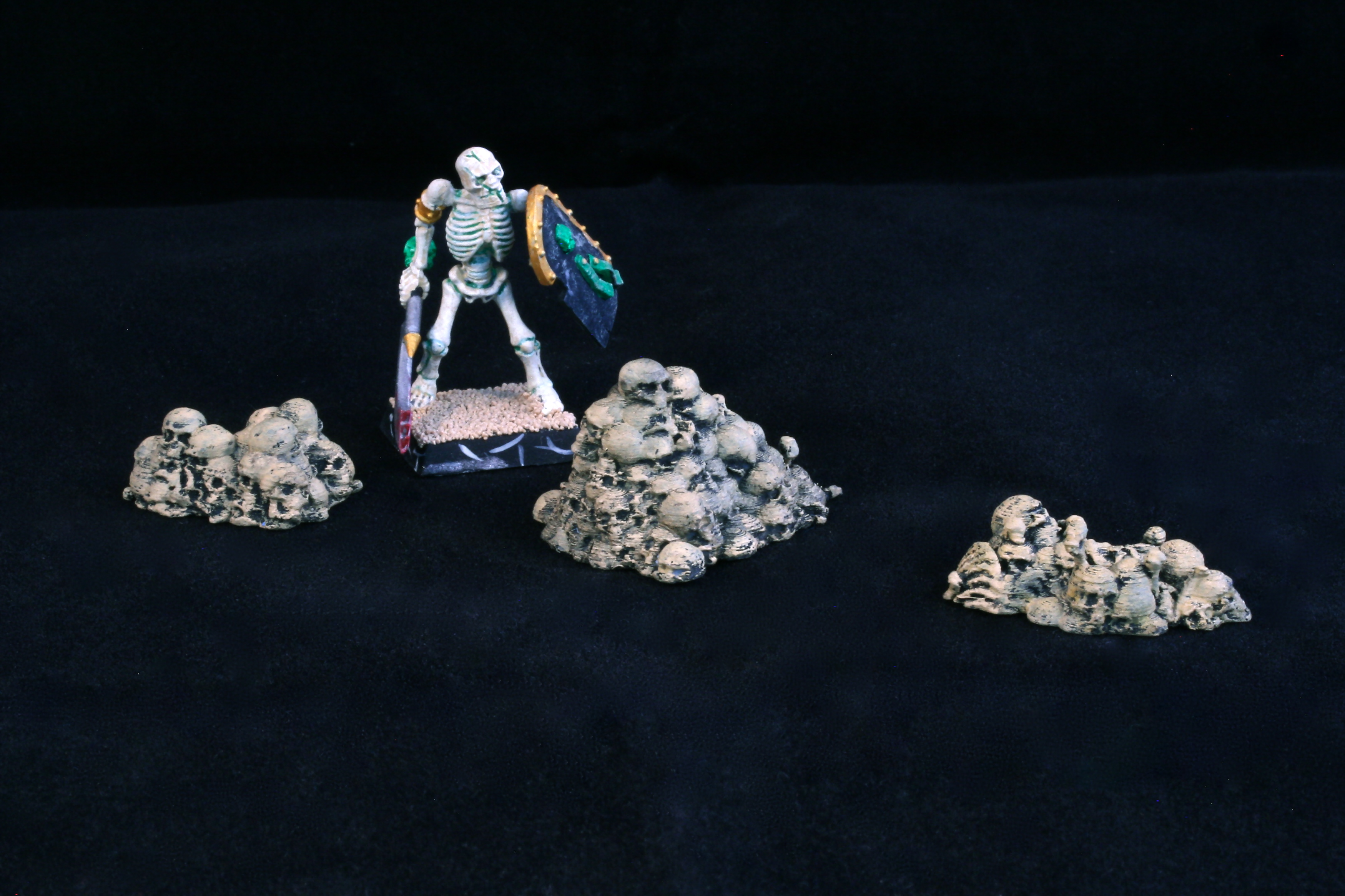 Bone Pile Rules: When a unit of Undead comes into contact with a Bone Pile, the player may roll a single D6 during the Magic Phase if a wizard is alive in the army. On a 5+ the unit gains an undead model, up to its original unit size. Only one attempt per Bone Pile per game.