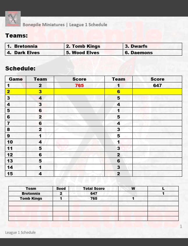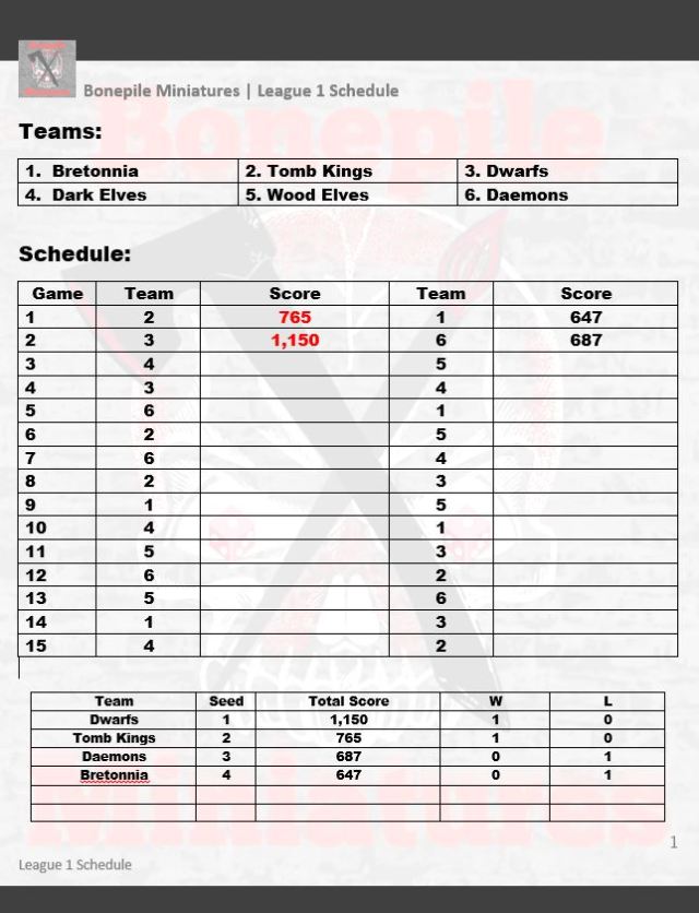 This Battle Report is part of a series of reports from a 1000 points tournament taken place at the Bonepile Miniatures Club. 6 players are competing with unique armies. This tournament is collectively considered Season 1. The Regular Season will match each of the participating 6 armies against each other once. Then a Playoffs Season will follow with a double-elimination bracket.