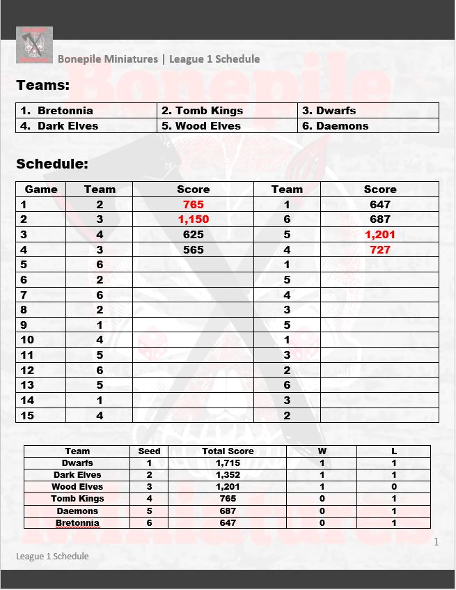This Battle Report is part of a series of reports from a 1000 points tournament taken place at the Bonepile Miniatures Club. 6 players are competing with unique armies. This tournament is collectively considered Season 1. The Regular Season will match each of the participating 6 armies against each other once. Then a Playoffs Season will follow with a double-elimination bracket.