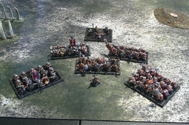 10 Longbeards. Great Weapons. Medium Armor. Ancestral Grudge. Relentless. Resolute. Old Grumblers. Full Command. Champion (Magmar Bonecleaver). 170 points.