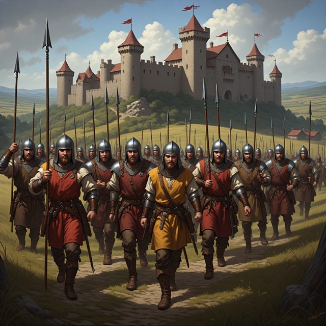 20 Men-at-arms. Halberds. Hand Weapons. Light Armor. Peasant’s Duty. Full Command. Champion (Brut). 130 points.
