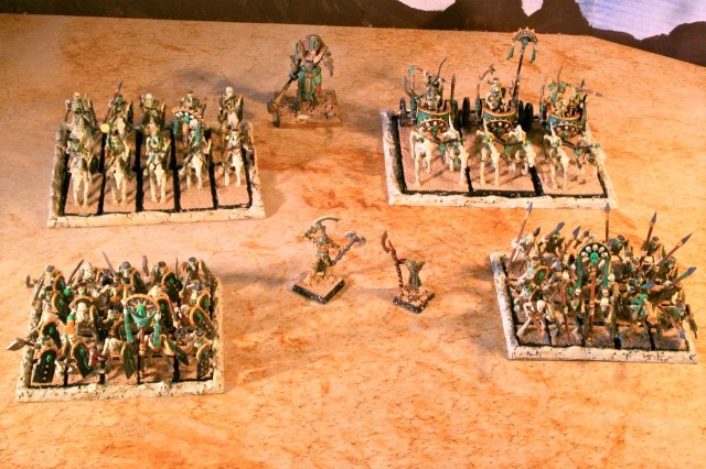 Warriors with Spears: This unit was deployed in the center of the Tomb Kings army formation. It was joined by the Tomb Herald. It Marched up the battlefield with their Herald. They suffered a few arrow attacks but were Charged by the unit Dryads. After 5 rounds of Combat, they were victorious over the Dryads. But, the Skeletal Warriors assisted in the slaughter from the rear of the Dryads. After finishing the Dryads, they reformed and fought off the Deepwood Scouts who had Charged into the Spearmen’s rear. They caused the Scouts to Break after two rounds of Close Combat. Then they Pursued and Caught them, and cut them all down. Then they reformed and Charged into the Eternal Guard in the last round of the game. They helped cut the Eternal Guard down to decimated levels.