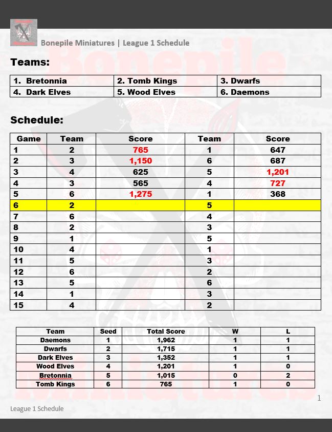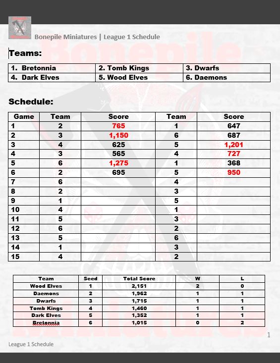 This Battle Report is part of a series of reports from a 1000 points tournament taken place at the Bonepile Miniatures Club. 6 players are competing with unique armies. This tournament is collectively considered Season 1. The Regular Season will match each of the participating 6 armies against each other once. Then a Playoffs Season will follow with a double-elimination bracket.