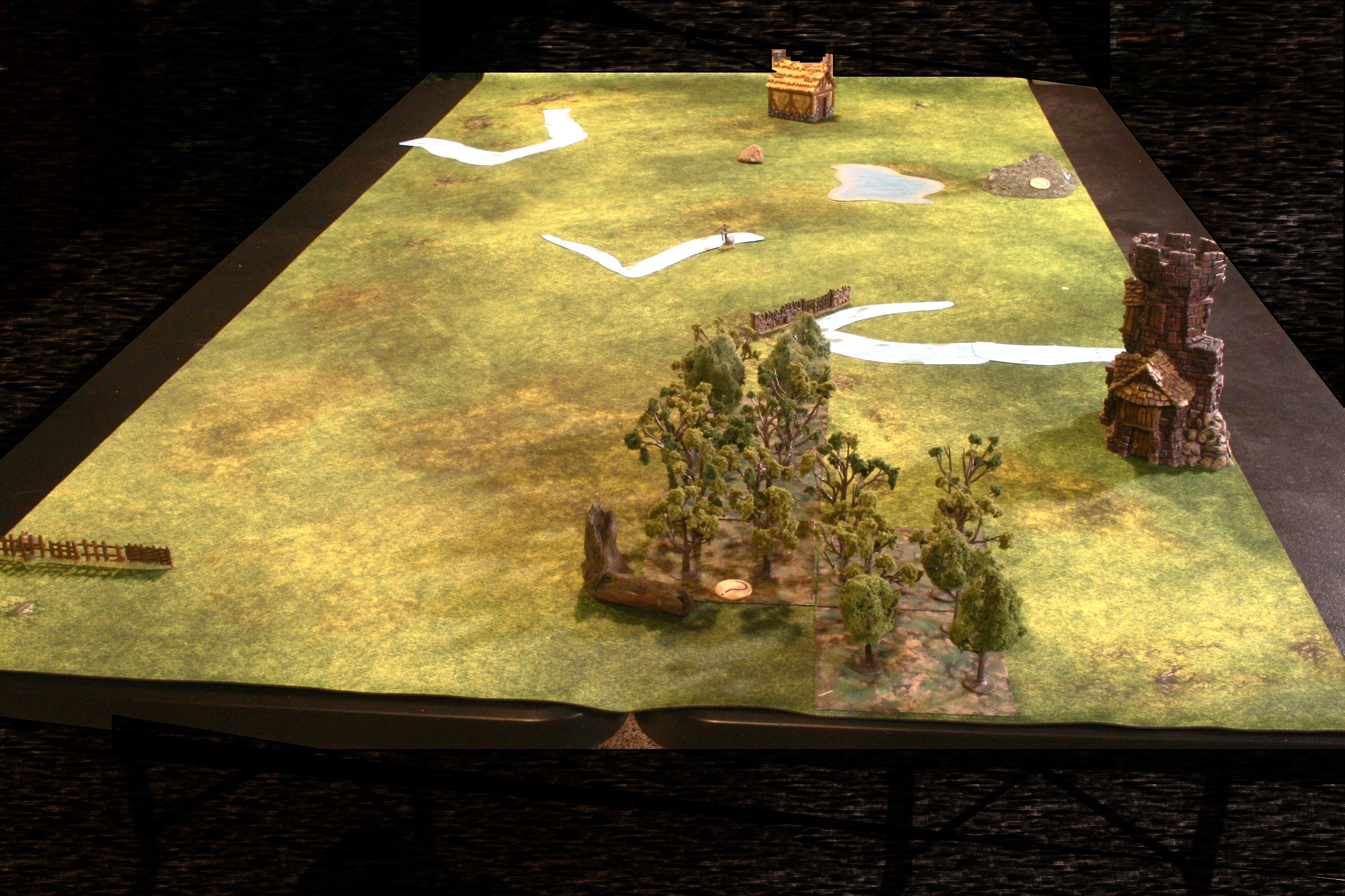 Normal Terrain: 3 Rivers. 1 Pond. 2 walls. 1 Tower. 1 House. 1 Rock. 1 Sign. 2 Logs.