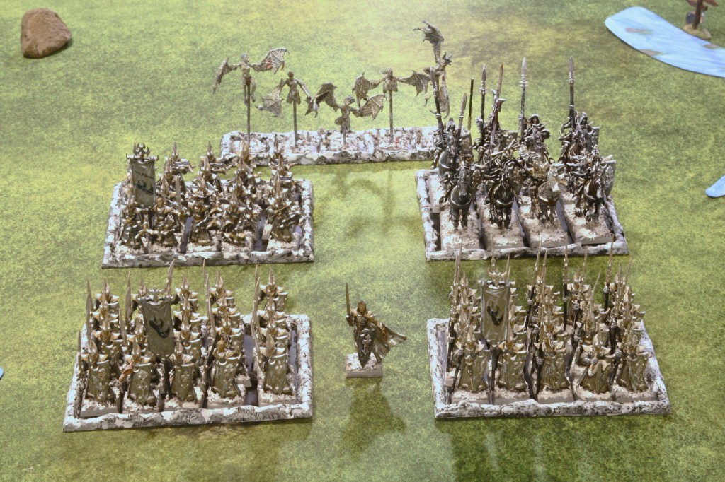 20 Dreadspears. Spears. Shields. Medium Armor. Elven Grace. Eternal Hatred. Murderous Prowess. Full Command. Champion (Shanga). 230 Points.